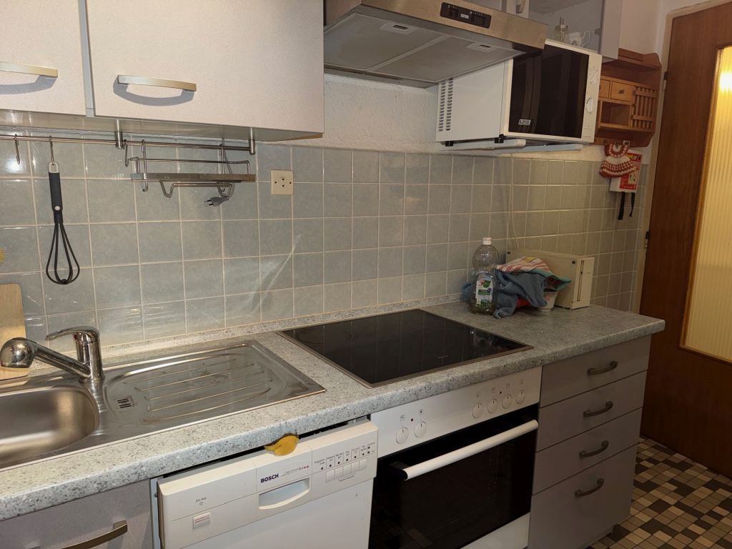 geschlossene Kochküche mit Einbaumöbeln und Elektrogeräten, Bad mit Dusche und Einbaumöbeln, separates WC