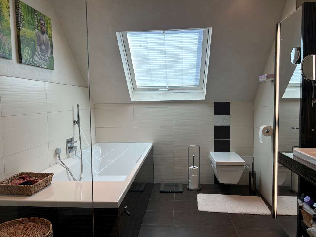 weitere Zimmer mit Laminatboden und heller Holzdecke, modernes Bad mit Fußbodenheizung, Einbaumöbeln,