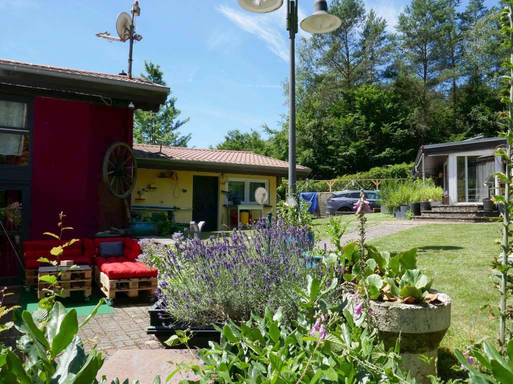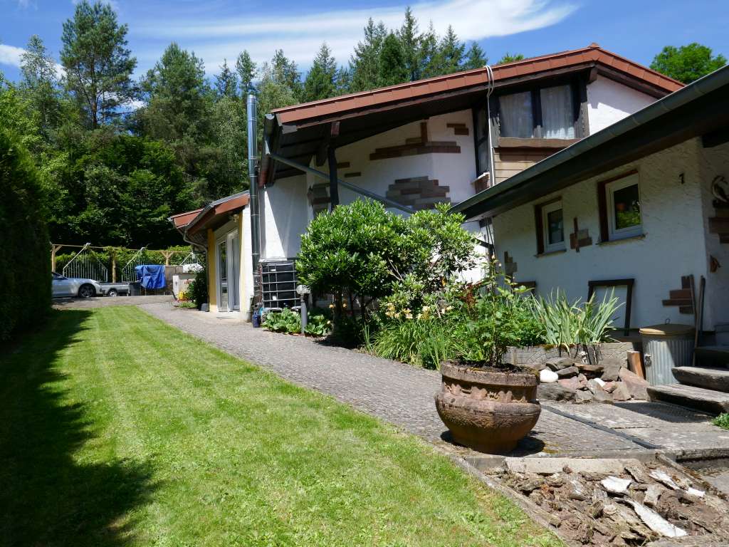 Schön gelegenes Wohn-/Ferienhaus im Chaletstil, UG massiv mit Holzaufbau, gebaut in den 70er Jahren, später durch einen kleinen massiven Anbau erweitert, ca. 180 m² Wohnfläche inklusiv einer kleinen Gästewohnung im Gartengeschoss, schönes Naturgrundstück, ca. 23.000 qm (nicht weiter bebaubar), fast komplett eingezäunt, z.T. angelegt mit großen Terrassen und skandinawischer Grillkota, Rest reine Natur mit Wald, Wiesen, Weiher und kleinem Bachdurchlauf, praktisch nicht einsehbar, kleines, separates Nebengebäude mit großer Süd-Terrasse und Garage