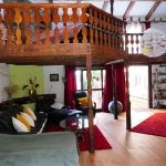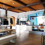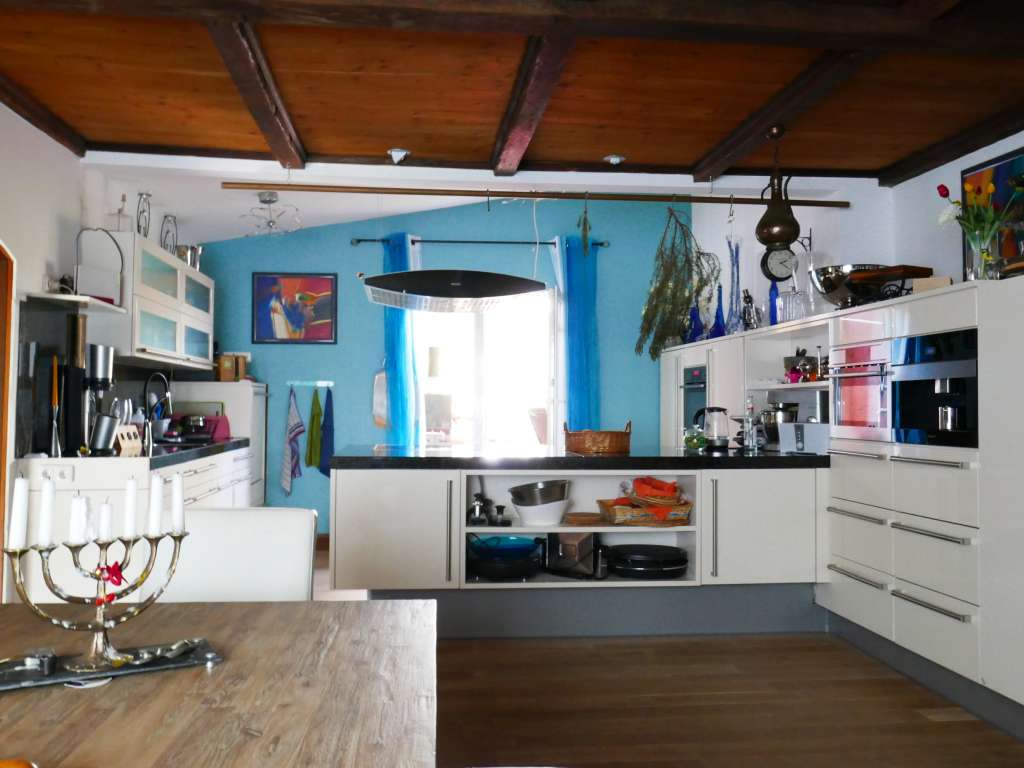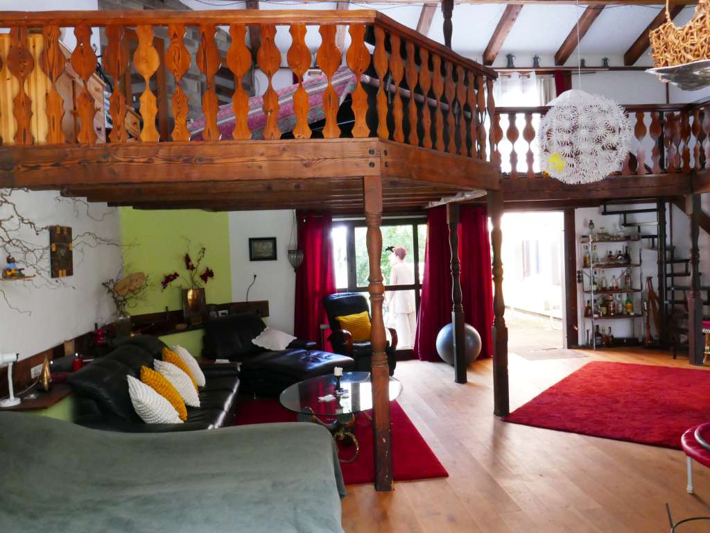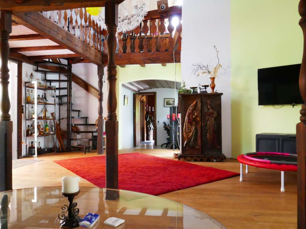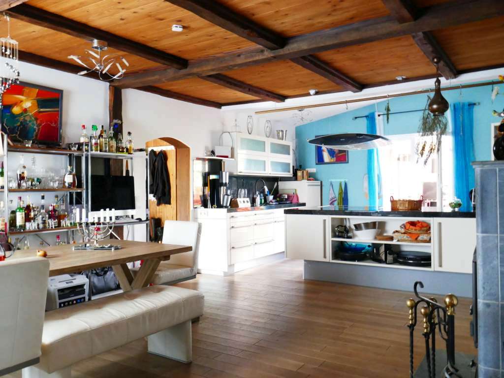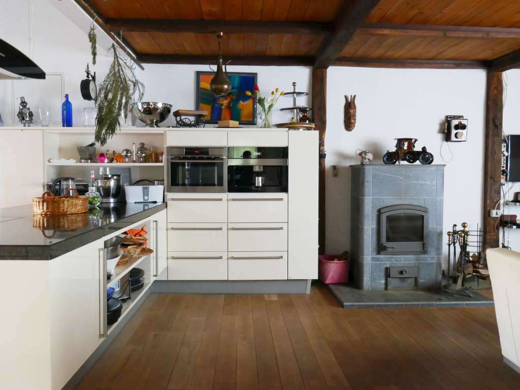 Erdgeschoss: kleines Entrée, loftartig ausgebauter, offener Wohnbereich mit Schlafempore, 2 schönen Kaminöfen, Dielenboden und Zugang zur Terrasse, großzügiges, lichtdurchflutetes Esszimmer mit Kaminofen (Speckstein), großen Glastüren mit elektrischer Öffnung, Dielenboden und Holzdecke, offen zur Einbauküche, Zugang zur Terrasse und zum Garten, Schlafzimmer mit Ankleideraum und Bambusparkettboden, Dusche-WC, Vorratsraum, Zugang zum Balkon, angebaute Garage