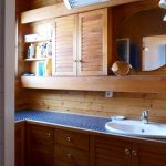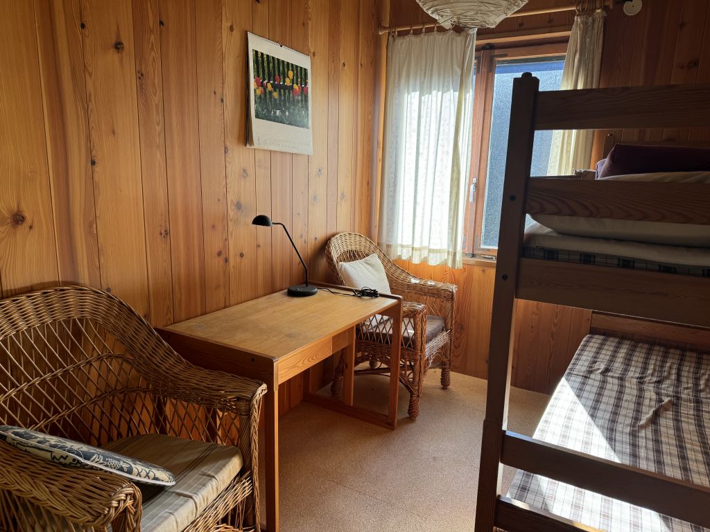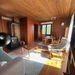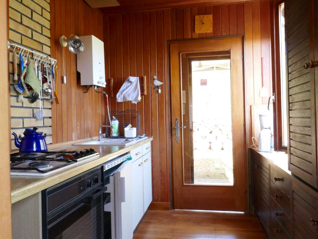 Einfache Ausstattung, schöner Holz-Kaminofen, Holzfenster mit Klappläden, Dielenböden, Holzdecken und -wände,