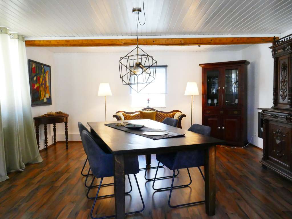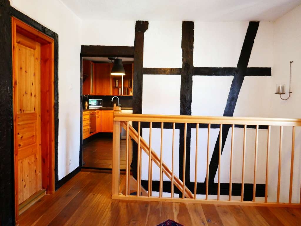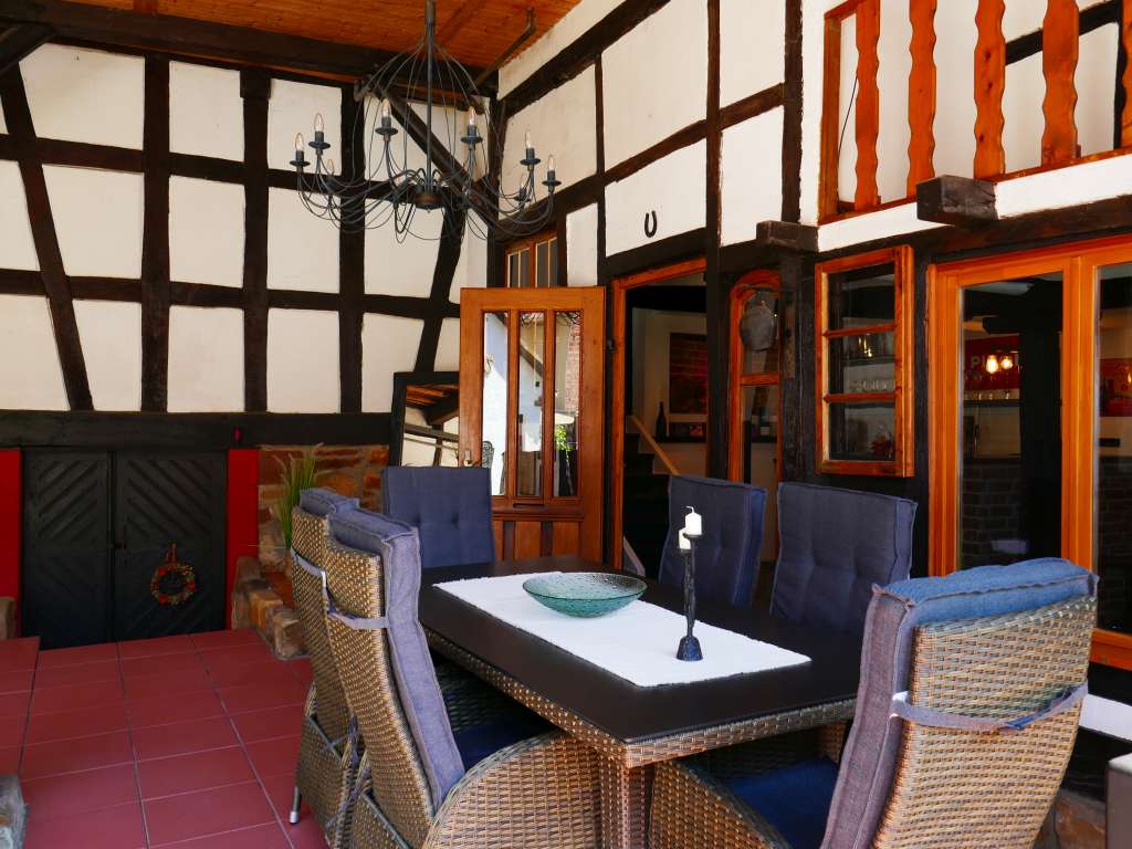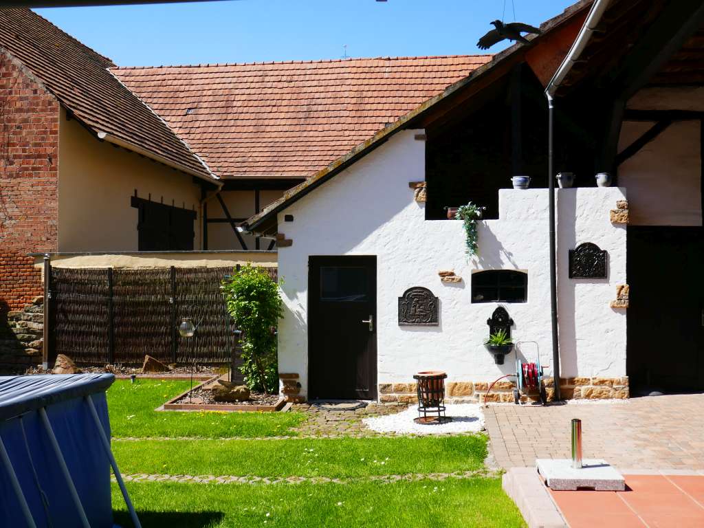 Charmantes Fachswerkanwesen mit stilvollem Wohnambiente, Bj. 1860, vor wenigen Jahren liebevoll renoviert, hochwertige Ausstattung, solide Bausubstanz mit bester Wärmedämmung, kein Renovierungsstau, ca. 225 m² Wohnfläche, schöne Raumaufteilung, hohe Räume (ca. 2,40 bis 2,50 Meter), viel Licht, Kellerraum mit Heizungsanlage, überdachter Stellplatz im Fachwerkanbau, große, separate Scheune (Garage) in gutem Zustand, ca. 900 m² Grundstück, großer, überdachter Freisitz, nicht einsehbarem Atriumhof mit Außenpool, Brunnen für Gartenbewässerung EG: schönes Entrée mit Bodenfliesen, gepflegter Salon mit hochwertigem Laminatboden und Deckenbalken, momentan als Empfangszimmer genutzt, gemütliches Gästezimmer mit Dielenboden, großes Bad in modernem Design, mit schönen Einbaumöbeln, freistehender Wanne und großer, ebenerdiger Dusche, separates WC – einige Stufen tiefer – gemütliche Hausbar mit schönem Kaminofen, Fernsehecke und verglastem Fachwerk, direkter Zugang zum überdachten Freisitz im Innenhof mit sichtbarem Fachwerk und originalen Balken sowie zur eingebauten Sommerküche mit Bodenfliesen und Holzdecke, offene Holztreppe zum OG OG: schöne Diele mit Dielenboden, großer, heller und freundlicher Wohnbereich mit originalem Dielenboden, Innenfachwerk und Einbauschrank, Einbauküche mit Bodenfliesen und Essplatz, großzügiger Schlafbereich mit Parkettboden, 2 Ankleideräume mit Parkettboden, Büro/Kinderzimmer mit Dielenboden, kleiner Abstellraum DG: ein Raum ausgebaut mit Laminatboden, Rest großer Speicher, noch ausbaubar UG: gesunder Keller mit Naturboden, moderner Heizungsanlage und Wärmepumpe für Warmwasser